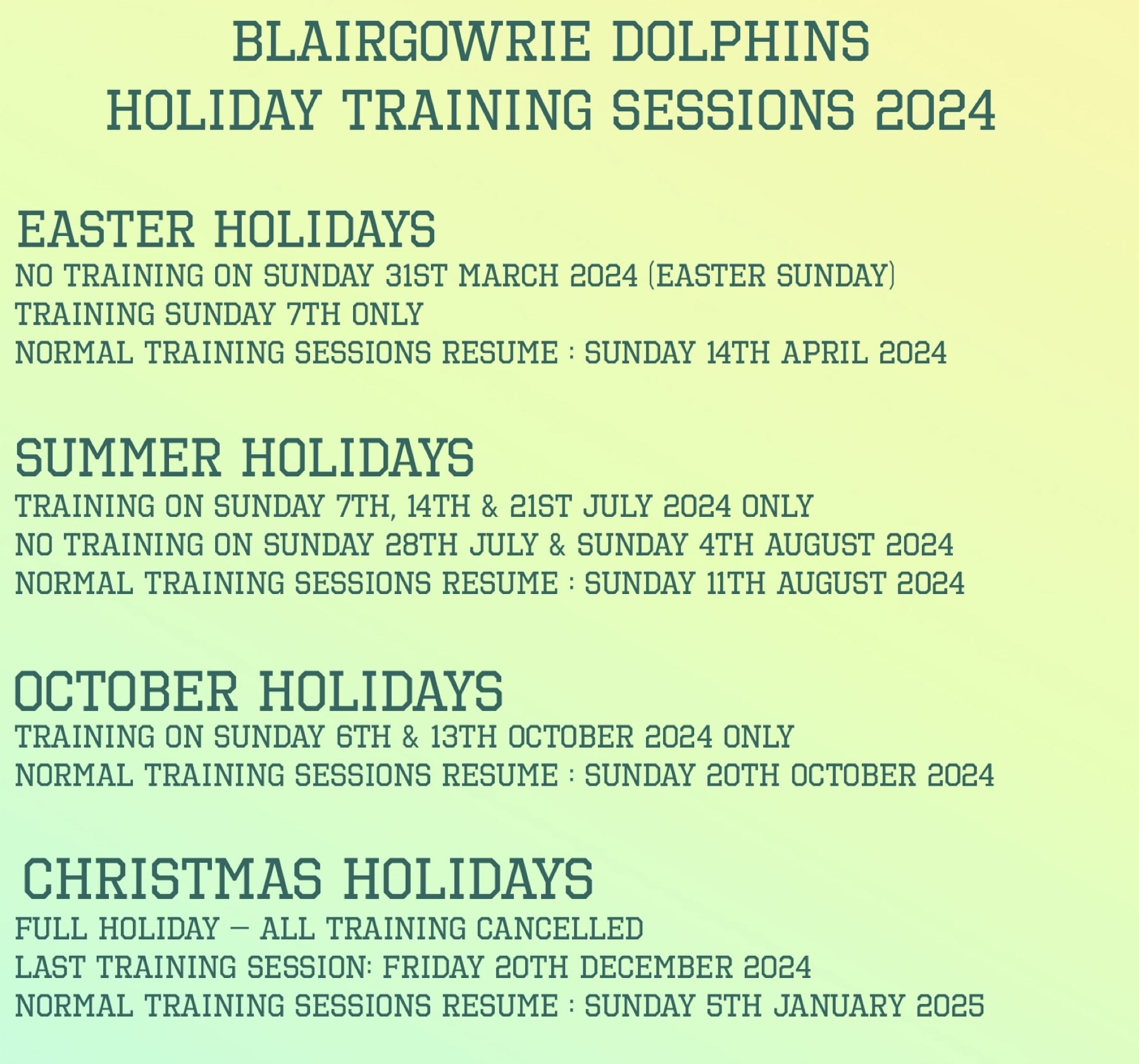 During school holidays the training schedule is altered as follows.