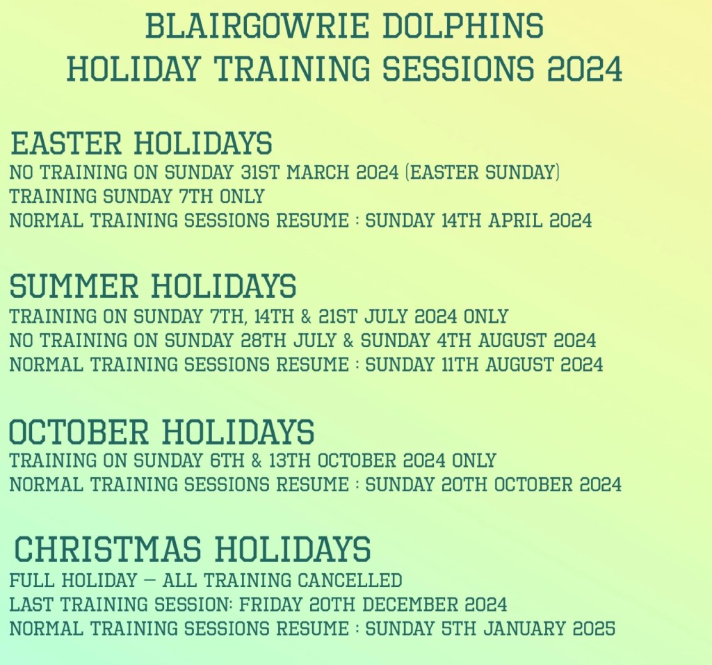 There are three squads in Blairgowrie Dolphins ASC. Coaches review individual development and advise swimmers on an individual basis when it is appropriate to move between squads. All squad moves will be made at the coaches’ discretion. The training timetable is as follows.